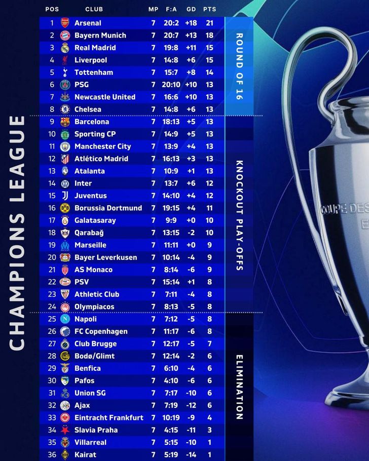 สรุปผลฟุตบอลยูฟ่า แชมเปี้ยนส์ ลีก 2025-26 รอบลีกเฟส นัดที่ 7