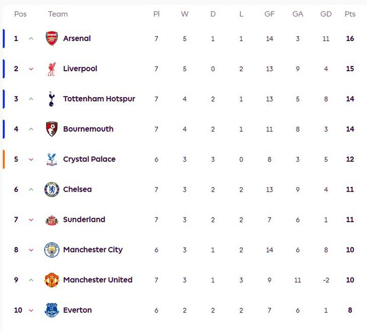 โดยหลังจากแข่งขันกันไปครบ 5 คู่ในสัปดาห์นี้ “ปืนใหญ่” อาร์เซนอล แซงนำจ่าฝูงด้วยการมี 16 คะแนน ส่วน “แชมป์เก่า” ลิเวอร์พูล แม้จะสะดุดแพ้เป็นนัดที่สอง ทำให้มี 15 คะแนนเท่าเดิม