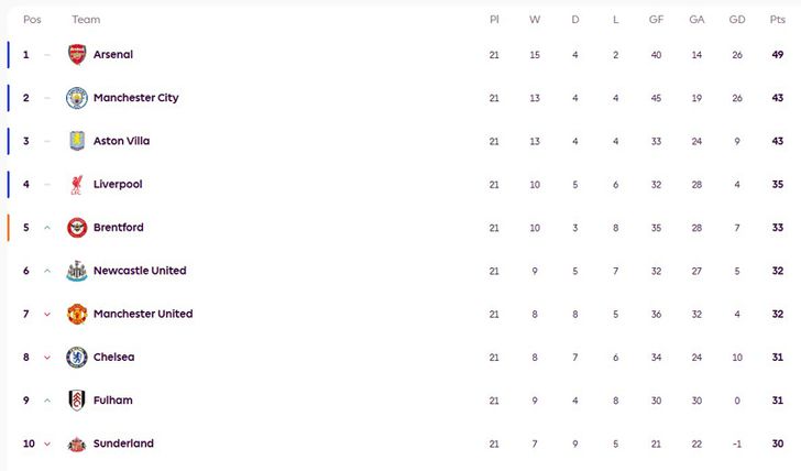 อันดับ 3 เป็นทางด้าน “สิงห์ผยอง” แอสตัน วิลลา มี 43 คะแนน ส่วน “หงส์แดง” ลิเวอร์พูล รั้งอันดับ 4 มี 35 คะแนน ตามหลังจ่าฝูงมากถึง 14 คะแนน