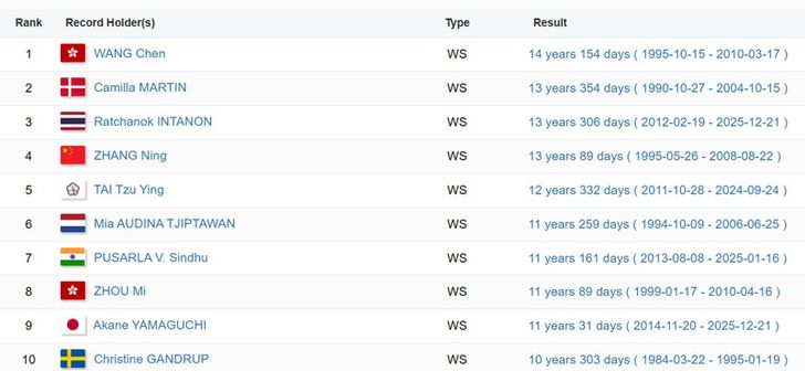 จากผลงานที่ยอดเยี่ยมตลอดระยะเวลาที่ผ่านมา ทำให้ “เมย์ รัชนก” ถือเป็นนักกีฬาแบดมินตันเพียงรายเดียวที่ยังคงเล่นอยู่ และยืนระยะอยู่ใน 10 อันดับแรกของ สหพันธ์แบดมินตันโลก (BWF) มาอย่างต่อเนื่องด้วยระยะเวลา 13 ปี กับอีก 306 วัน และยังคงดำเนินต่อไป