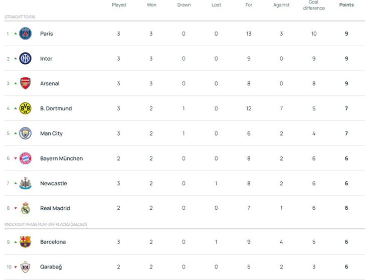 โดยหลังแข่งขันกันไป 9 คู่ ในโปรแกรมนัดสาม ปรากฏว่า “แชมป์เก่า” เปแอสเช ทีมแกร่งจากฝรั่งเศส ผงาดยึดจ่าฝูงหลังเก็บชัยรวดทั้งสามนัด เช่นเดียวกับ อินเตอร์ มิลาน และ อาร์เซนอล แต่ประตูได้เสียดีกว่า