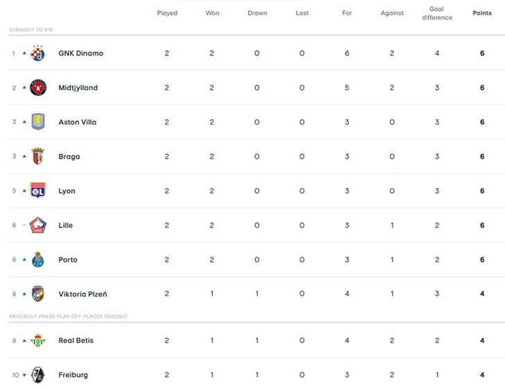 โดยหลังแข่งขันกันไปครบทุกคู่ ในโปรแกรมนัดสอง ปรากฏว่า ดินาโม ซาเกร็บ ทีมดังจากโครเอเชีย ผงาดยึดจ่าฝูงหลังเก็บชัยรวดทั้งสองนัด เช่นเดียวกับอีก 6 ทีมที่ก็เก็บชัยได้ทั้ง 2 เกม แต่ประตูได้เสียดีกว่า