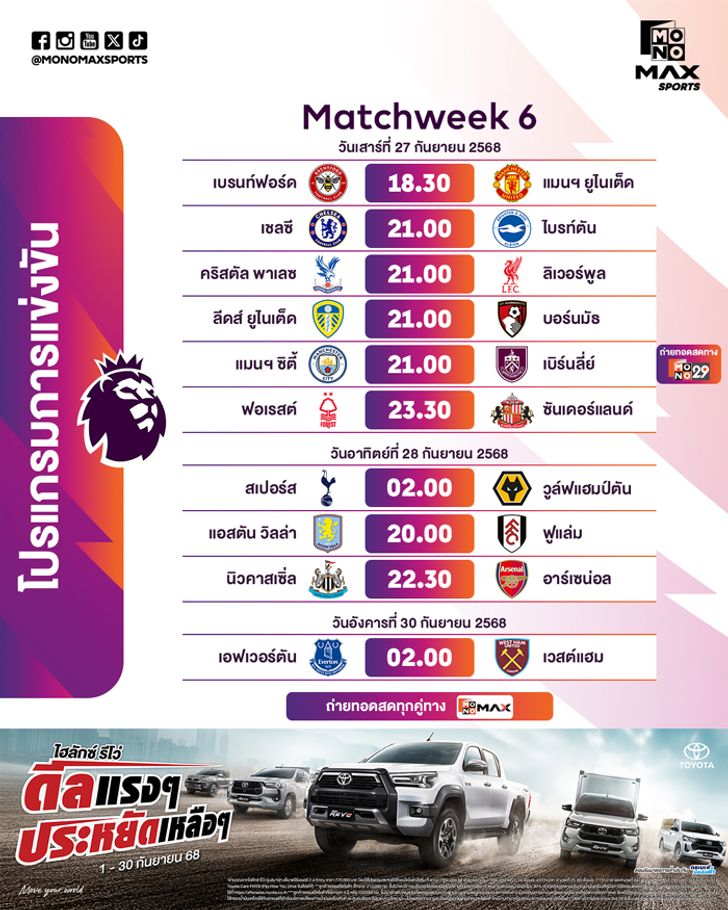 โปรแกรมพรีเมียร์ลีก 2025/26 สัปดาห์ที่ 6